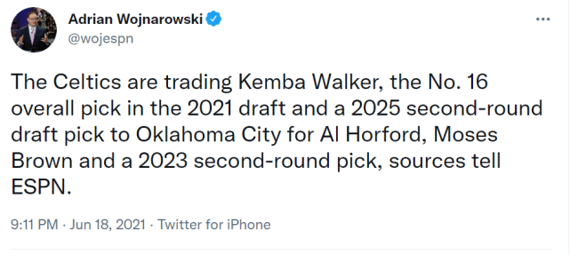 JRS直播网讯 北京时间6月18日,据ESPN名记沃纳罗斯基报道,凯尔特人和雷霆达成了一笔3换3的交易,凯尔特人送出肯巴-沃克、2021年的首轮16号签和2025年的次轮签,得到雷霆的艾尔-霍福德、摩西-布朗和2023年的次轮签。
