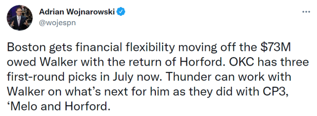 值得一提的是霍福德重回波士顿,他曾经在那里效力过三个赛季,为绿军出战208场比赛,场均13.5分7篮板4.6助攻。沃纳罗斯基表示,送走沃克让绿军获得薪金的灵活度。今年夏天,雷霆将拥有3个首轮签,他们可以像当初使用保罗、甜瓜和霍福德那样,来和沃克进行合作。