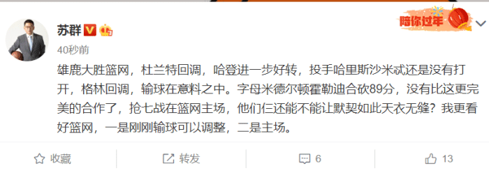 20日,只隔一天,抢七大战就要来了,篮网的体能是个考验,这一场的决战必然备受关注。对于抢七大战,苏群直言更看好篮网,因为两个理由:“我更看好篮网,一是刚刚输球可以调整,二是主场。”此外,苏群也指出雄鹿的三巨头是否还能延续这场出色的发挥,这也是比赛的一个关键。