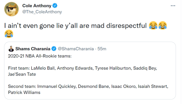 JRS直播网讯北京时间6月18日,NBA官方公布最佳新秀阵容。入选一阵的包括三球、萨迪克-贝、爱德华兹、哈利伯顿、泰特,入选二阵的包括贝恩、奥科罗、奎克利、斯图尔特和帕特里克-威廉姆斯。魔术21岁新秀科尔-安东尼认为自己成为了最佳新秀阵容的遗珠,并在社媒上公开吐槽。