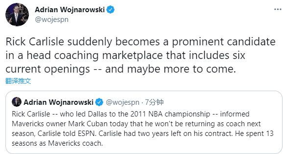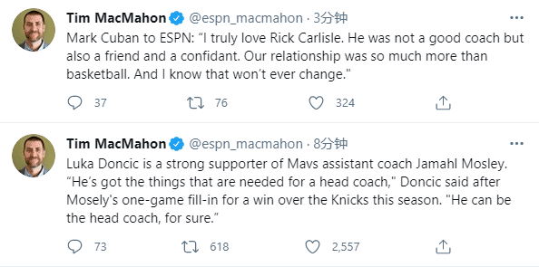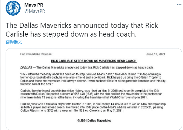 卡莱尔发表离队声明:在过去一周与库班进行了多次面谈之后,今天我告诉他我将不再担任达拉斯独行侠队的主教练。这完全是我和我家人的决定;达拉斯将永远是我的家,我对我教练生涯的下一个篇章感到兴奋。