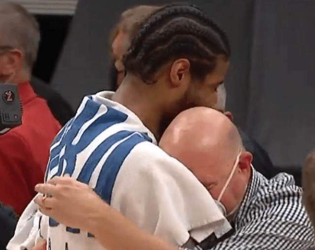 杜兰特超神的表现之后,主教练纳什感激的抱住了阿杜,同样,在乔治超神的表现后,快船队老板鲍尔默也是复制了这一幕,鲍尔默深情的抱住乔治,久久不愿意放开,鲍尔默的话语也逗得帅气的乔治露出了笑容。