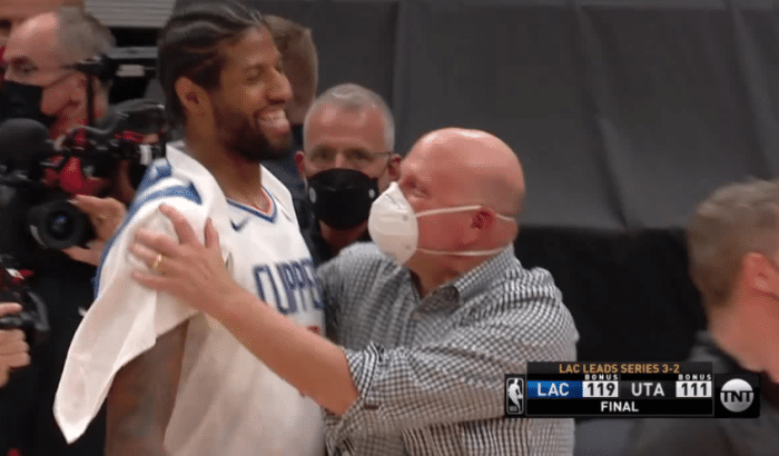 快船赢球后,大佬鲍尔默第一时间怒吼庆祝,然后他主动走到乔治身边,紧紧拥抱乔治,此时乔治咧嘴大笑;这一幕像极了此前杜兰特打满48分钟轰下49+17+10超级三双带队赢球,纳什深情拥抱杜兰特。