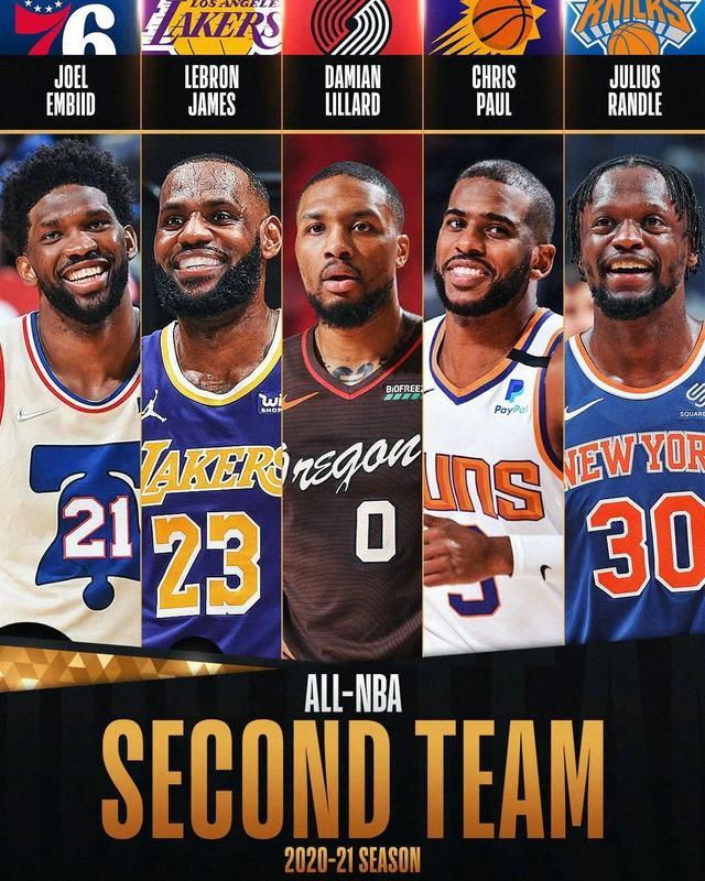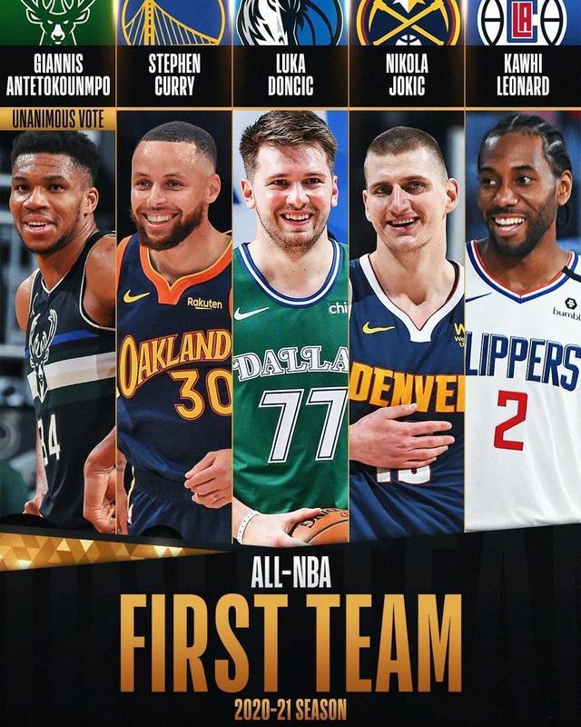 JRS直播网讯,昨天NBA联盟公布了20-21赛季最佳阵容的名单,其中最佳阵容一阵由库里、东契奇、伦纳德、字母哥、约基奇领衔;最佳阵容第二阵容则由保罗、利拉德、兰德尔、詹姆斯、恩比德入选二阵。三阵则有巴特勒、戈贝尔、乔治、比尔、欧文。