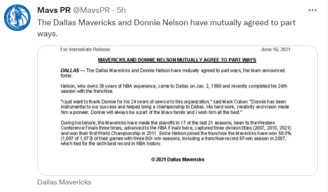 JRS直播网讯 北京时间6月17日,独行侠官方宣布,球队和总经理小尼尔森双方同意分道扬镳。小尼尔森拥有36年在NBA工作的经验,他在1998年1月2日加入独行侠,为这支球队工作了24个赛季。