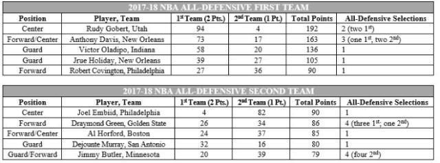 JRS直播网讯北京时间2018年5月24日,NBA官方公布了2017-2018赛季NBA常规赛最佳防守阵容一、二队名单,爵士中锋戈贝尔得到了94张最佳防守第一阵的选票,无可置疑的入选最佳防守一阵,另外入选最佳一阵的还有安东尼-戴维斯(新奥尔良鹈鹕队)、考文顿(费城76人队)、奥拉迪波(印第安纳步行者队)、霍勒迪(新奥尔良鹈鹕队)。