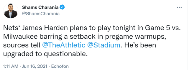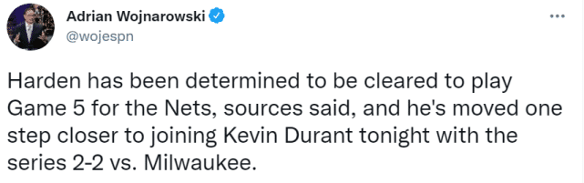 官方状态的提升,也代表哈登离最终出战越来越近。两位名记的报道,都证实了一点,哈登本人已经决定要打这场比赛。他和杜兰特能够联手出战G5,无疑也提升了篮网的战斗力,增加了胜出的可能性。