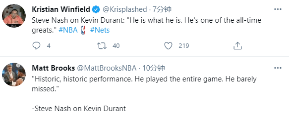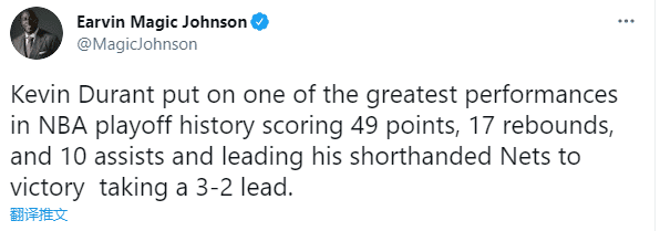 湖人名宿魔术师发推写道:凯文-杜兰特上演了 NBA 季后赛历史上最伟大的表现之一,得到 49 分、17 个篮板和 10 次助攻,带领人手不足的网队以 3-2 领先取得胜利;魔术师还写道雄鹿输给篮网,没有人会责怪他们;言外之意就是杜兰特太厉害了。
