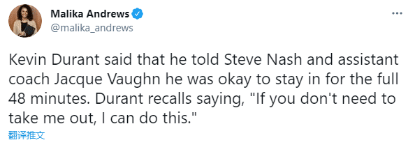杜兰特回应打满48分钟,他告诉纳什以及教练组:我本来没计划打满全场,但当我们落后的时候,我告诉教练,如果你们不需要我休息,我可以做到打满全场。