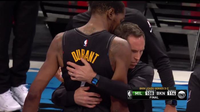 篮网114-108逆转险胜,赛后篮网主教练纳什紧紧抱住杜兰特,就像抱着大哥似的;接受采访时,纳什表示如果杜兰特不打48分钟,我们可能不会赢,杜兰特的表现是历史级别的,如此表现太荒谬了。