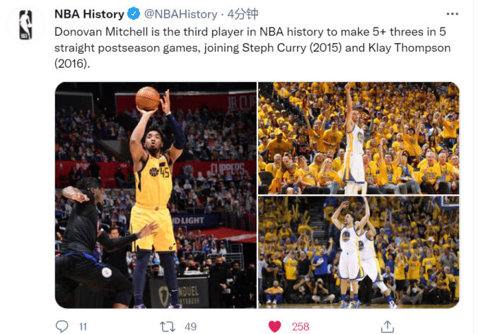 JRS直播网讯北京时间6月15日,快船主场118比104再次击败爵士,从而将大比分改写为2比2!这场比赛,爵士当家球星米切尔个人表现依旧炸裂再次砍下37分,季后赛打到现在,米切尔创造了一连串里程碑。据NBA官方统计,米切尔是历史第3位连续五场季后赛命中至少5记三分的球员,比肩库里和汤普森。