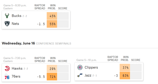 FiveThirtyEight还更新了三场天王山之战的获胜概率。天王山之战中,更被看好的是主场作战的篮网、费城和爵士,他们在G5的获胜概率依次是55%、71%和63%。