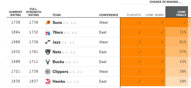 JRS直播网讯北京时间6月15日,2020-21赛季的分区半决赛激战正酣,除了太阳4-0横扫掘金率先晋级,其余三组对决的总比分都打到了2-2,竞争相当激烈!这意味着三组对决都将迎来天王山之战,数据网站FiveThirtyEight更新了三组对决的晋级概率(括号内为晋级概率)——
