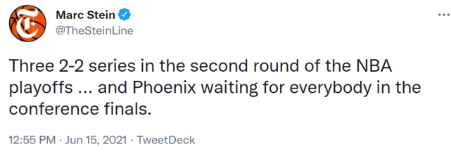 名记马克-斯坦恩写道:“NBA季后赛第二轮出现三组2-2打平的系列赛,菲尼克斯在分区决赛等待大家。”