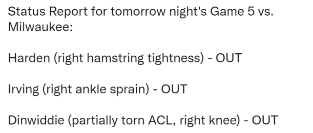 纳什在接受采访时透露,欧文已经接受核磁共振检查,确认脚踝扭伤,但他表示自己并不知道欧文脚踝扭伤的级别。纳什还表示他不确定欧文能否在这轮系列赛中复出。哈登在纳什接受采访时依然在球馆里训练,当时纳什表示不知道哈登的出战状态,但篮网官方很快就确认哈登同样不能打G5。