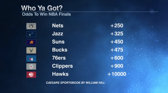 排名第六的是快船(+900),快船虽然扳回一城,但他们整体状态很不稳定,已经不是最被看好夺冠的球队。垫底的是老鹰(+10000),从数字上来看,几乎没人认为老鹰有机会。毕竟,他们要想夺冠,先得闯进总决赛,而横亘在他们面前的首先是实力强大的费城,就算闯过费城这一关,无论篮网还是雄鹿,都是他们应付不了的对手。