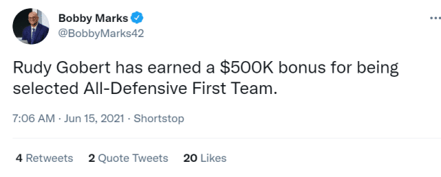 戈贝尔和西蒙斯都是全票入选一阵,两人分别得到100张一阵的选票,累计得分200分。格林得分176分,霍乐迪157分,字母哥135分。二阵的5名球员中,阿德巴约和巴特勒都是111分,恩比德87分,塞布尔63分,莱昂纳德43分。薪金专家鲍比-马克斯表示,戈贝尔由于入选最佳阵容一阵,将激活合同的奖励条款,获得50万美元的奖金,霍乐迪得到10万奖金。