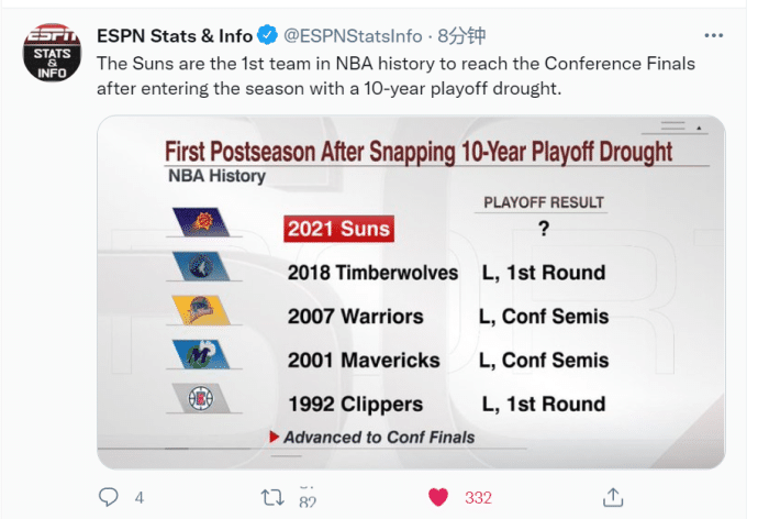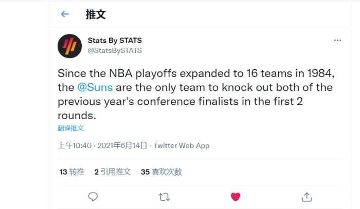 NBA季后赛从1984年扩充到16支球队,太阳是历史第一支在季后赛前两轮淘汰了上季打入分区决赛选手的球队,湖人和掘金去年相遇西决。