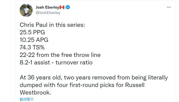 整个系列赛,保罗场均25.5分10.25助攻真实命中率74.3%,罚球22中22,助攻失误比是8.2-1!记者josh调侃,36岁的保罗,两年前就被火箭抛弃,用4个首轮换来了威少。