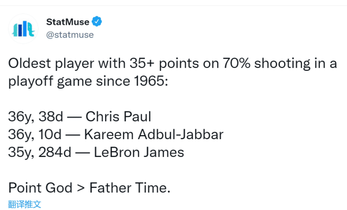 36岁38天的保罗以至少70%命中率砍下35+,自1965年以来,他是年纪最大做到这一点的球员,超越了36岁10天的贾巴尔。