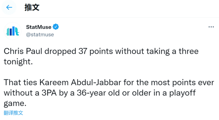全场比赛,保罗没有出手三分砍下37分,在NBA历史所有36岁以上的球员中,37分追平了无三分出手的最高得分纪录!