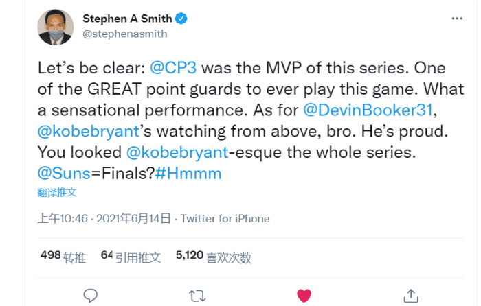 而名嘴斯蒂芬A史密斯盛赞:保罗是这轮系列赛的MVP,历史上最伟大的控卫之一,多么轰动的个人秀,科比肯定会为保罗感到骄傲的!
