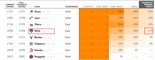 赛后,数据网站FiveThirtyEight第一时间更新了晋级概率和夺冠概率。篮网本轮的晋级概率从G4赛前的70%跌至58%,而夺冠概率从21%跌至17%。单论夺冠概率,他们原先和费城并列第三,如今已经跌至第四。前三位依次是太阳(25%)、爵士(23%)和费城(22%)。