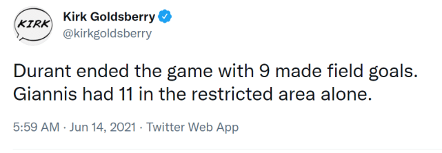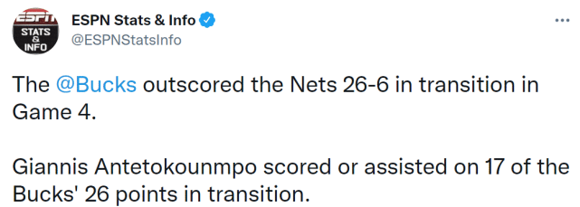 数据显示,本场比赛,雄鹿快攻得分26-6完爆篮网,其中字母哥一人得到或助攻队友得到其中的17分。另外数据专家也表示,杜兰特全场只投中9个球,而字母哥在限制区内打进了11个球。