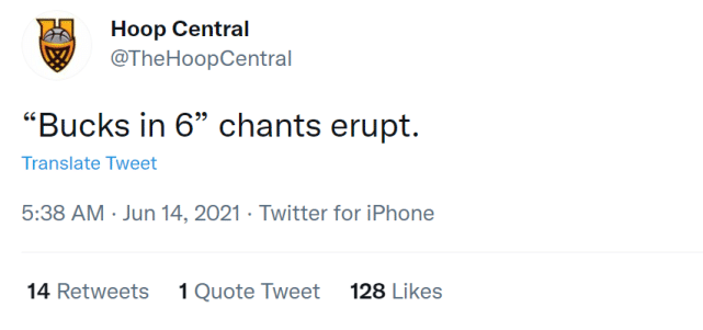 篮网在雄鹿主场遭遇两连败,也让雄鹿球迷信心大振。比赛快要结束时,雄鹿主场球迷高喊:“Bucks in 6(雄鹿6场晋级)!”
