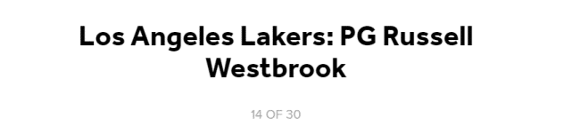 B/R认为打造詹姆斯+浓眉+威斯布鲁克的三巨头组合后,再签下一些射手,就可以让湖人重新成为很有实力竞争总冠军的球队。