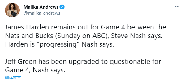 JRS直播网讯 北京时间6月13日,篮网对阵雄鹿G4伤情出炉,哈登因大腿伤势继续缺席比赛,杰夫-格林被列为出战成疑(50%可能性出战),纳什透露哈登康复最新情况;名记透露丁威迪很快就会归队。