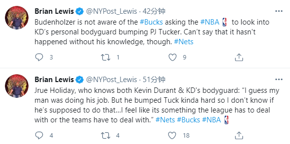 雄鹿主帅布登霍尔泽表示他不知道雄鹿要求联盟调查杜兰特保镖攻击塔克,但篮网记者Brian Lewis表示布帅不知情,并不代表这件事没发生,言外之意就是雄鹿要求联盟介入调查了。