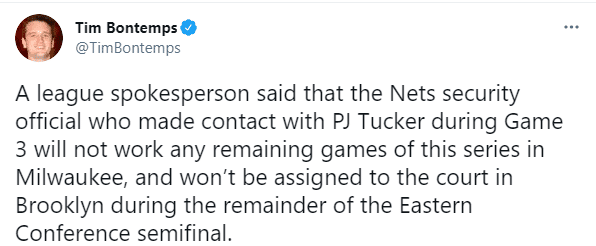 据名记Tim Bontemps报道,联盟调查结果曝光,由于篮网安保(杜兰特保镖)G3和塔克发生身体接触,联盟不准他在篮网和雄鹿剩下系列赛中出现,也不准他在本轮系列赛到篮网主场工作。这就相当于联盟在东部半决赛中禁赛杜兰特保镖。