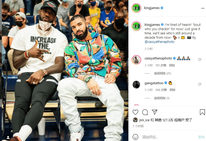 JRS直播网讯 昨天布朗尼伤愈复出,詹姆斯到现场观战,说唱歌星Drake以及杜德利、JR史密斯也来捧场;不久前詹姆斯晒出他与Drake坐在场边的同框合影,并且写道:我已经厌倦了听说你现在关注的人是谁;给点时间吧,我们会看到10年后谁仍然还在这里。