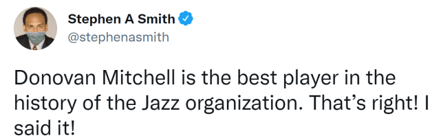 JRS直播网讯北京时间6月12日,爵士球星多诺万-米切尔在季后赛表现出色,6场比赛场均贡献32.7分3篮板5.3助攻,投篮命中率48.2%,目前,爵士在系列赛中2-0领先快船。知名球评斯蒂芬-A-史密斯认为米切尔已经是爵士队史上最好的球员,他的言论引起不小的争议。