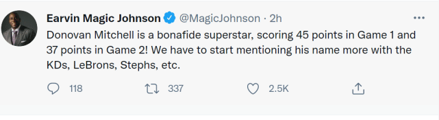 看好米切尔的还不只是史密斯一人,“魔术师”约翰逊也在社媒上猛夸米切尔:“米切尔是一位真正的超级巨星,他在次轮的G1砍下45分,G2又得到37分!今后我们讨论超级巨星时,除了杜兰特、詹姆斯和库里等球星外,得更多提到米切尔的名字。”