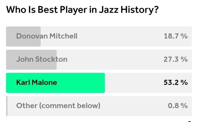 B/R根据史密斯的言论,发布了一项投票:谁是爵士队史上的最佳球员?结果显示,53.2%的球迷选择卡尔-马龙,27.3%的球迷选择斯托克顿,18.7%的球迷选择米切尔,另有0.8%的球迷选择其他人。