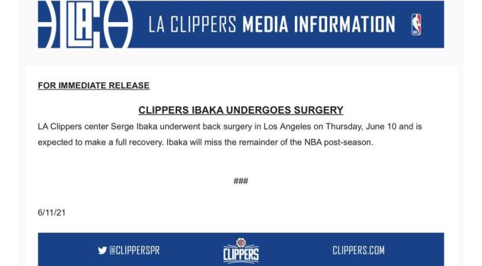 JRS直播网讯北京时间6月12日,据名记shams报道,快船悍将伊巴卡已经接受背部手术,将会缺席赛季剩下的比赛,确定赛季报销,预计伊巴卡能够痊愈;随后快船官宣伊巴卡赛季报销,他是昨天在洛杉矶接受的手术。