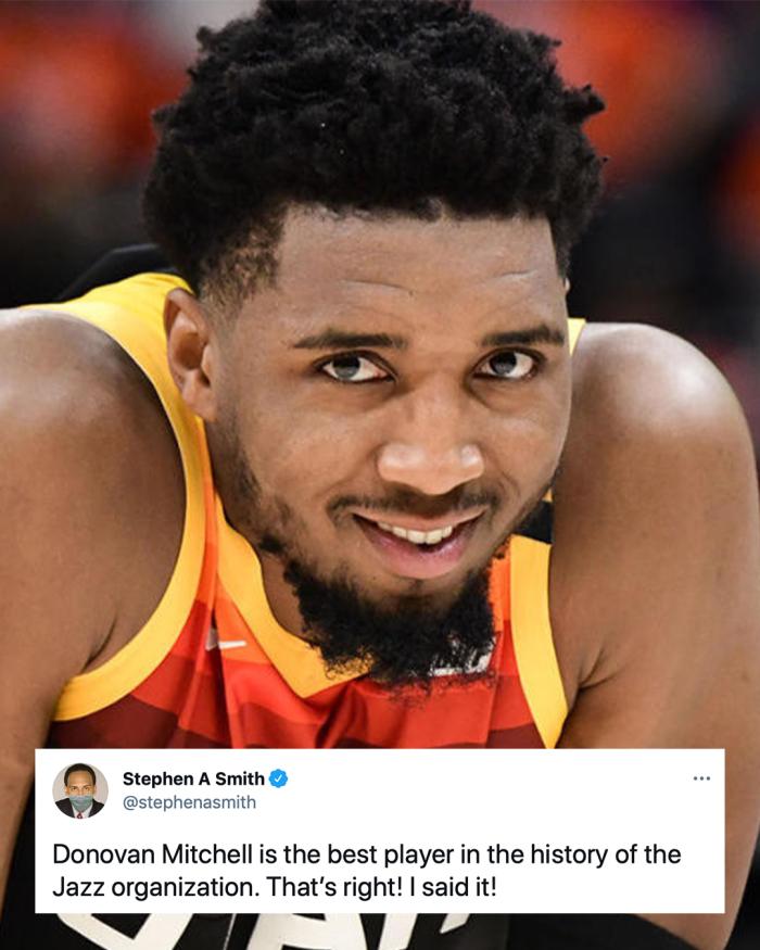 名嘴“美国杨毅”A 史密斯称赞米切尔是韦德2.0版本,他是超级巨星以及比赛终结者;目前米切尔的表现比小卡和乔治都要好,而且他才24岁;我不想听到卡尔-马龙,也不想听到斯托克顿,米切尔就是爵士队史最好的球员。