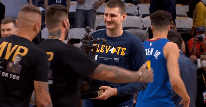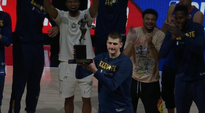 当约基奇在主场捧起MVP奖杯时,现场球迷为他高呼MVP,如此呼声十分响亮;穆雷等队友则是站在约基奇身后,集体为他鼓掌欢呼庆祝。