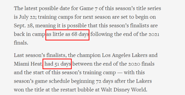 根据之前的报道,本赛季总决赛G7的时间是7月23日,而新赛季的训练营开启是9月29日,这意味着进入总决赛的两支球队若打到抢七大战,将只有68天的休息时间。不过,比起上赛季的湖人和热火,他们还是能多歇半个月左右。湖人和热火在夺冠后51天就回到了训练营。
