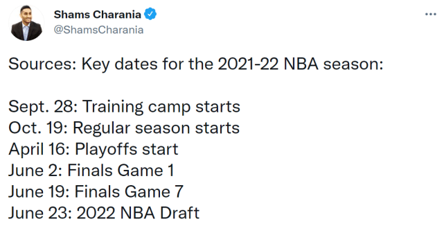 JRS直播网讯 北京时间6月11日,据名记查拉尼亚报道,2021-22赛季的6大关键日期已经曝光。训练营将在2021年9月29日(北京时间,下同)开启,常规赛于2021年10月20日开打,季后赛将在2022年4月17日开打,总决赛G1的时间是2022年6月3日,总决赛G7的时间是2022年6月20日,2022年选秀大会将在6月24日进行。