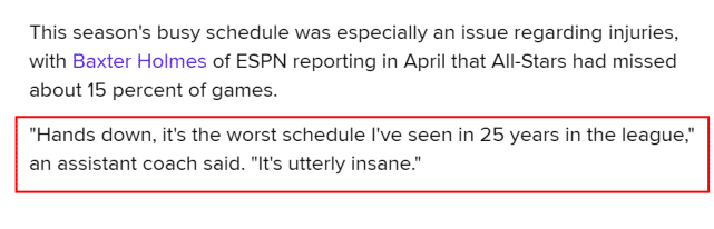 此前,ESPN记者巴克斯特-霍姆斯报道称,今年的全明星球员大概缺席了15%的比赛。“毫无疑问,这是我在联盟25年以来见过最糟糕的赛程安排,简直是疯了,”一个助理教练感慨道。