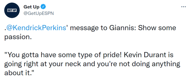 名嘴帕金斯在节目上对字母哥说道:“你总得有些尊严吧!凯文-杜兰特都压在你脖子上了,你却什么都没做!”