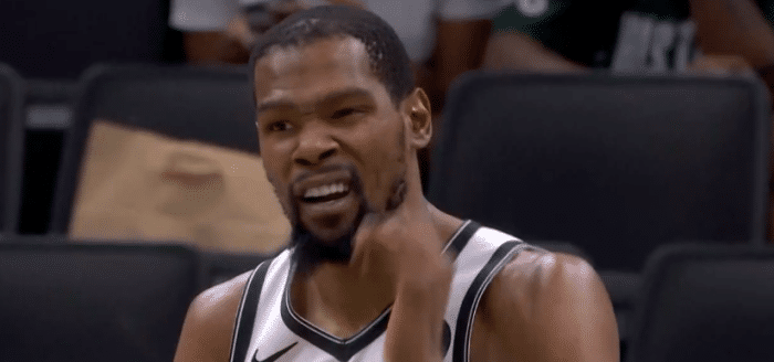 上半场,哈登疯狂庆祝十分抢镜,另外要说的是杜兰特惨遭PJ-塔克打脸以及挠眼,当时杜兰特眯着眼十分难受,不过裁判没有升级判罚,这只一次普通犯规。