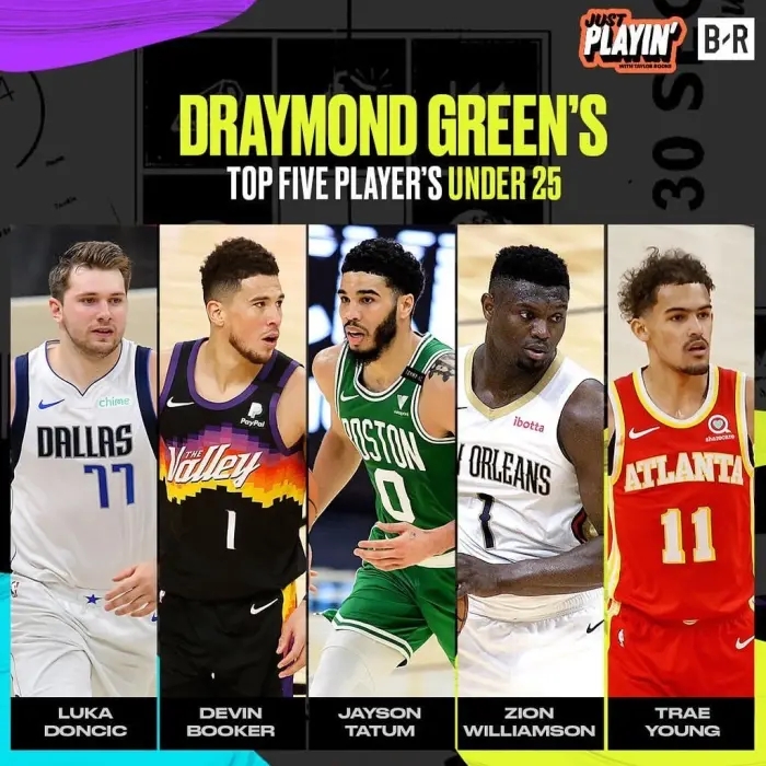 JRS直播网讯北京时间6月10日,追梦格林今日参加《Just Playin》节目时选出了他心目中现役25岁以下球员中的TOP5,东契奇领衔这个榜单!