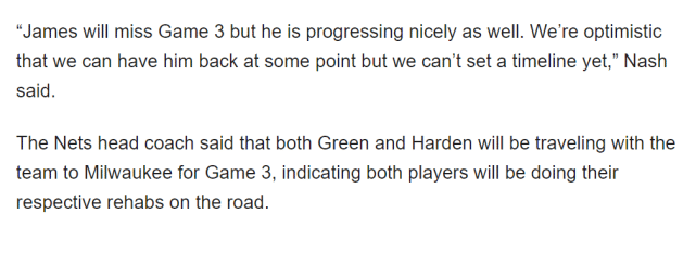 纳什透露,哈登和格林都将随队飞往密尔沃基,为队友助威的同时,也有利于他们在客场继续接受队医和训练师的治疗。