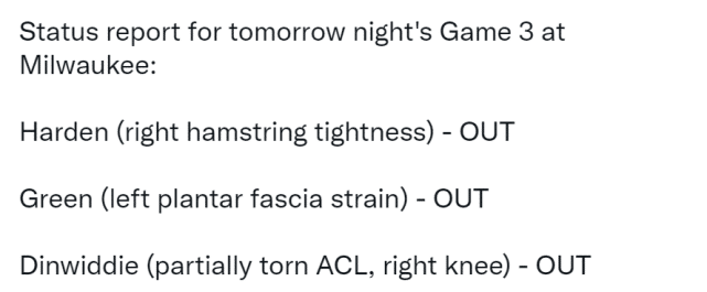 JRS直播网讯北京时间6月10日,篮网宣布了G3的伤病名单,哈登(右腿筋紧张)、格林(足底筋膜拉伤)、丁威迪(右膝韧带部分撕裂)将缺席这场比赛。纳什在接受采访时更新了伤情进展,带来了一些好消息。