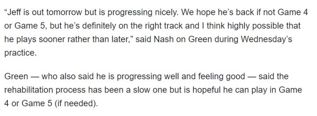 “杰夫(格林)明天不能打,但他的进展良好。我们预计他就算不能在G4或者G5回归,也会很快回来。”格林本人表示他希望自己能在G4或者G5(如有必要)上场。常规赛阶段,格林场均11分3.9篮板1.6助攻,投篮命中率49.2%,三分命中率41.2%,是篮网重要的轮换成员。
