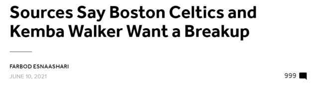 JRS直播网讯北京时间6月10日,据《体育画报》记者Farbod Esnaashari报道,肯巴-沃克很可能已经打完了绿军生涯的最后一场比赛,消息人士称,双方都想在休赛期结束合作关系。